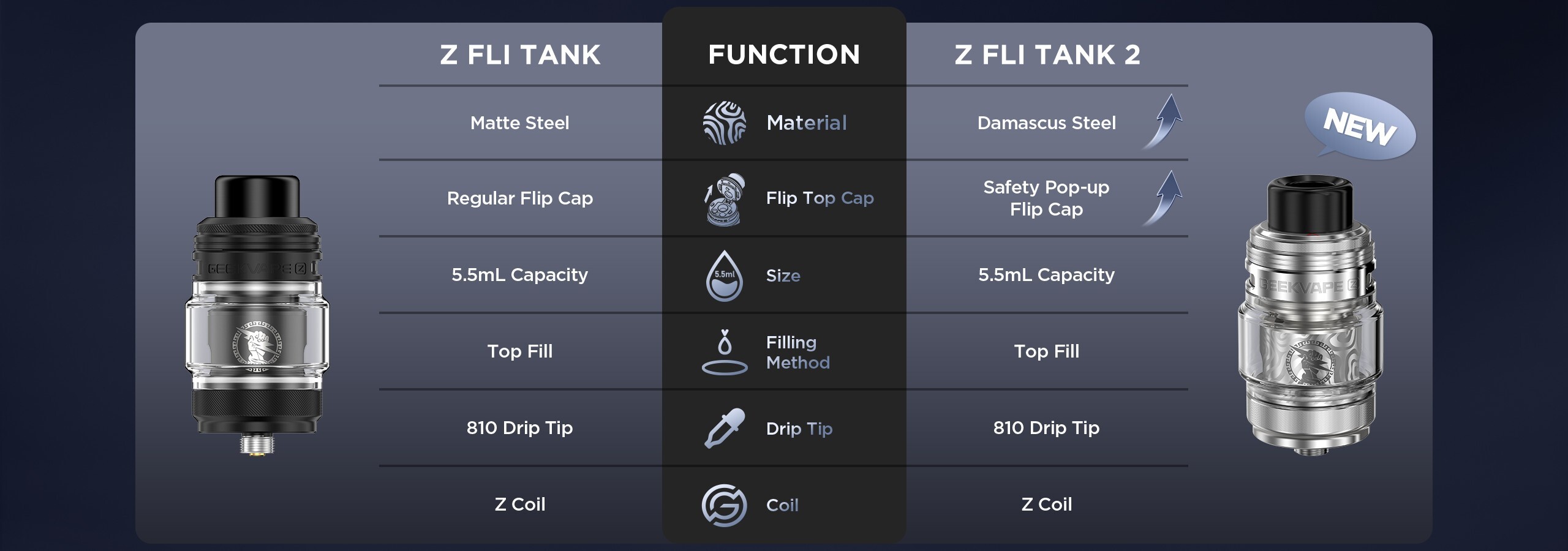 Introducing the Geekvape Z FLI Tank 2, a high-performance sub-ohm tank engineered for vapers who demand durability, style, and leak-proof performance. Designed with a bold Damascus steel aesthetic, this tank features precise top airflow control, a 5.5mL capacity, and an upgraded flip-top fill system for quick and mess-free refills. The Z FLI 2 is fully compatible with the popular Geekvape Z Series Coils, making it perfect for dense clouds and rich flavor. With its top airflow leakproof system, the Z FLI Tank 2 eliminates messy leaks while enhancing vapor production. Whether you’re upgrading your setup or pairing it with the Aegis Legend 5 mod, the Geekvape Z FLI Tank 2 delivers next-level performance and standout design.