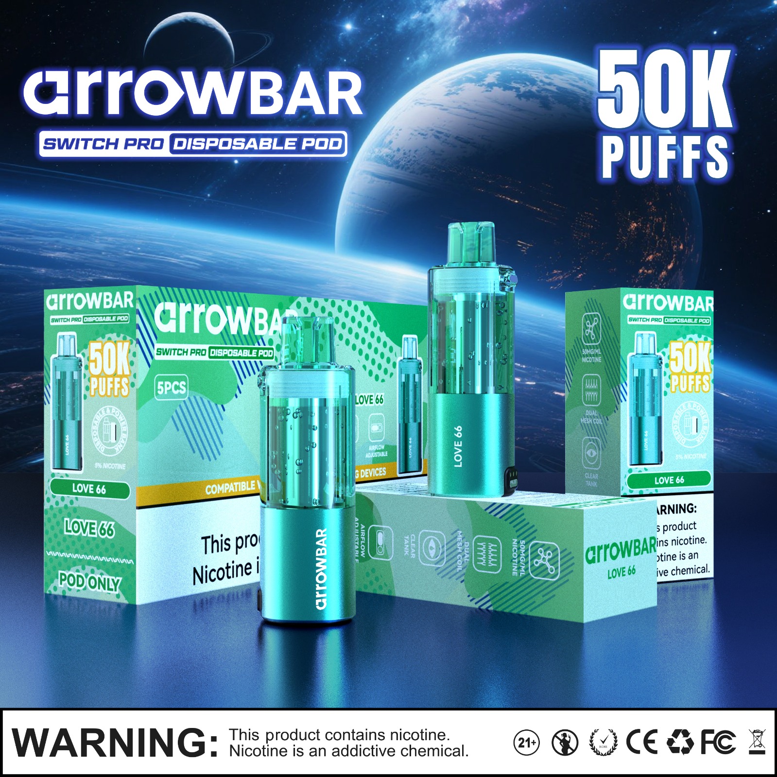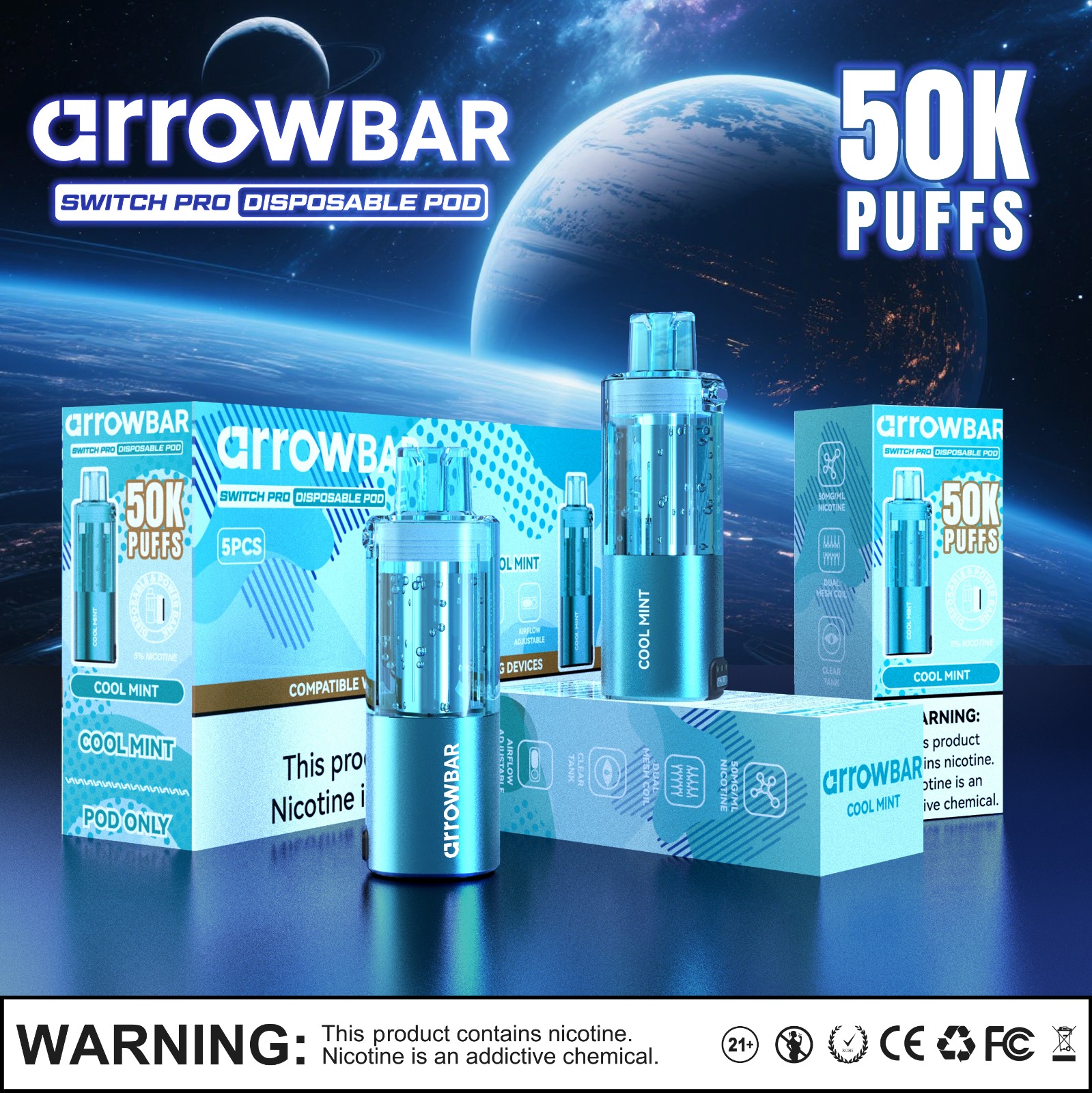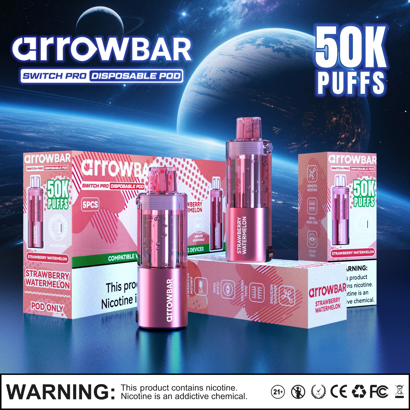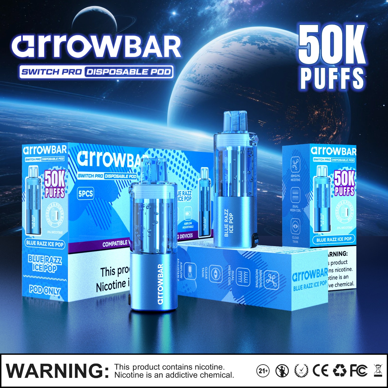 The ARROW BAR SWITCH PRO DISPOSABLE VAPE POD 50K PUFF 5CT is a high-capacity disposable vape pod system designed to deliver powerful performance and bold flavor options. Manufactured by Arrow Bar, this device combines advanced vape technology with a sleek modern design, making it a strong choice for retailers seeking premium disposable vape products.