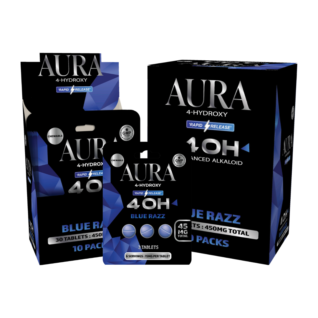 The AURA 4-OH tablet lineup combines convenience, portability, and bold flavor options that appeal to customers looking for tablet-based botanical products in a retail-ready display.