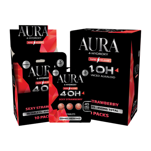 The AURA 4-OH 3CT 45MG TABLETS 10PK BOX offers a convenient tablet format designed for precise dosing and easy portability. Each retail display contains 10 packs, with every pack including 3 tablets delivering a total of 45mg.
