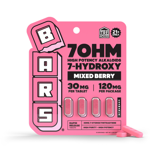 The BARS X TRE HOUSE 4CT 120MG 7-OH TABLETS 10PK BOX is a convenient tablet product created for customers who prefer a simple, portable, and pre-measured format. Each retail-ready box includes 10 packs, with every pack containing 4 tablets totaling 120mg.