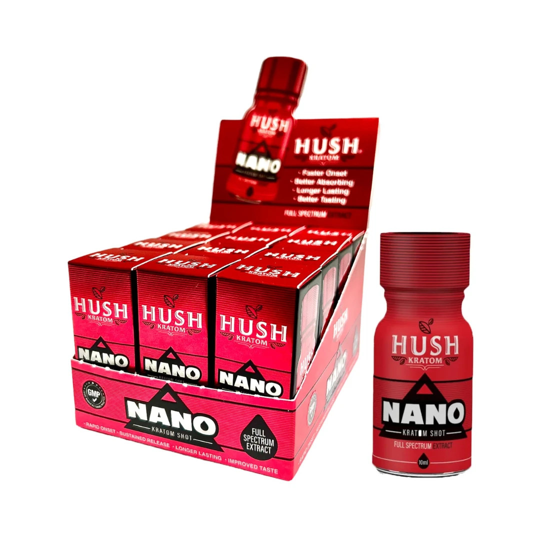 The HUSH KRATOM NANO 10ML SHOTS 12CT BOX features a concentrated kratom extract in a compact liquid shot format designed for portability and convenience. Each bottle contains 10ml of liquid kratom extract, making it a small and easy-to-use option for customers who prefer liquid kratom products.