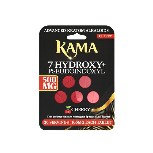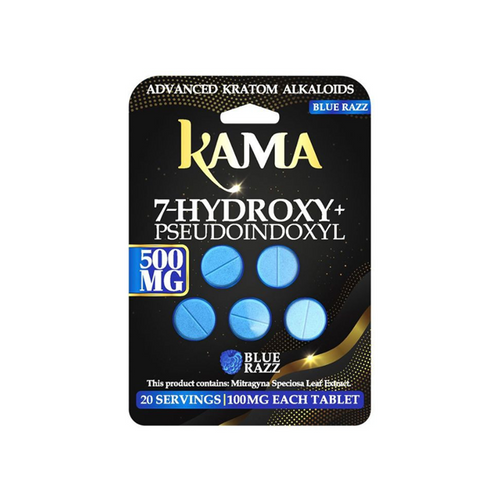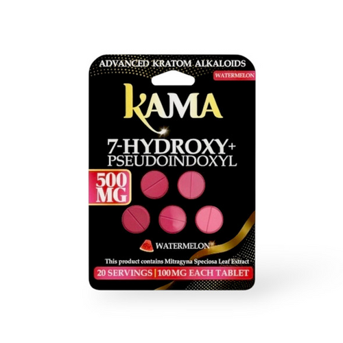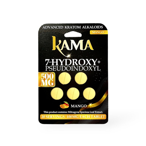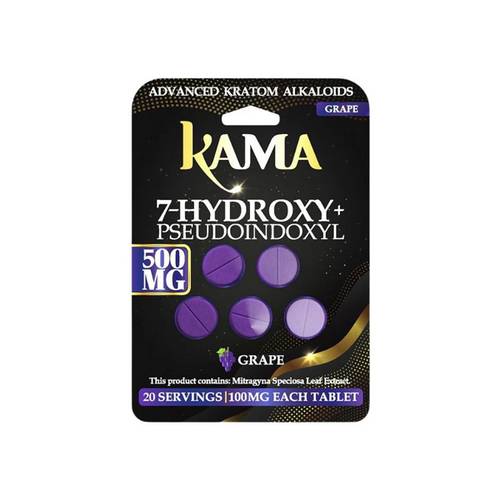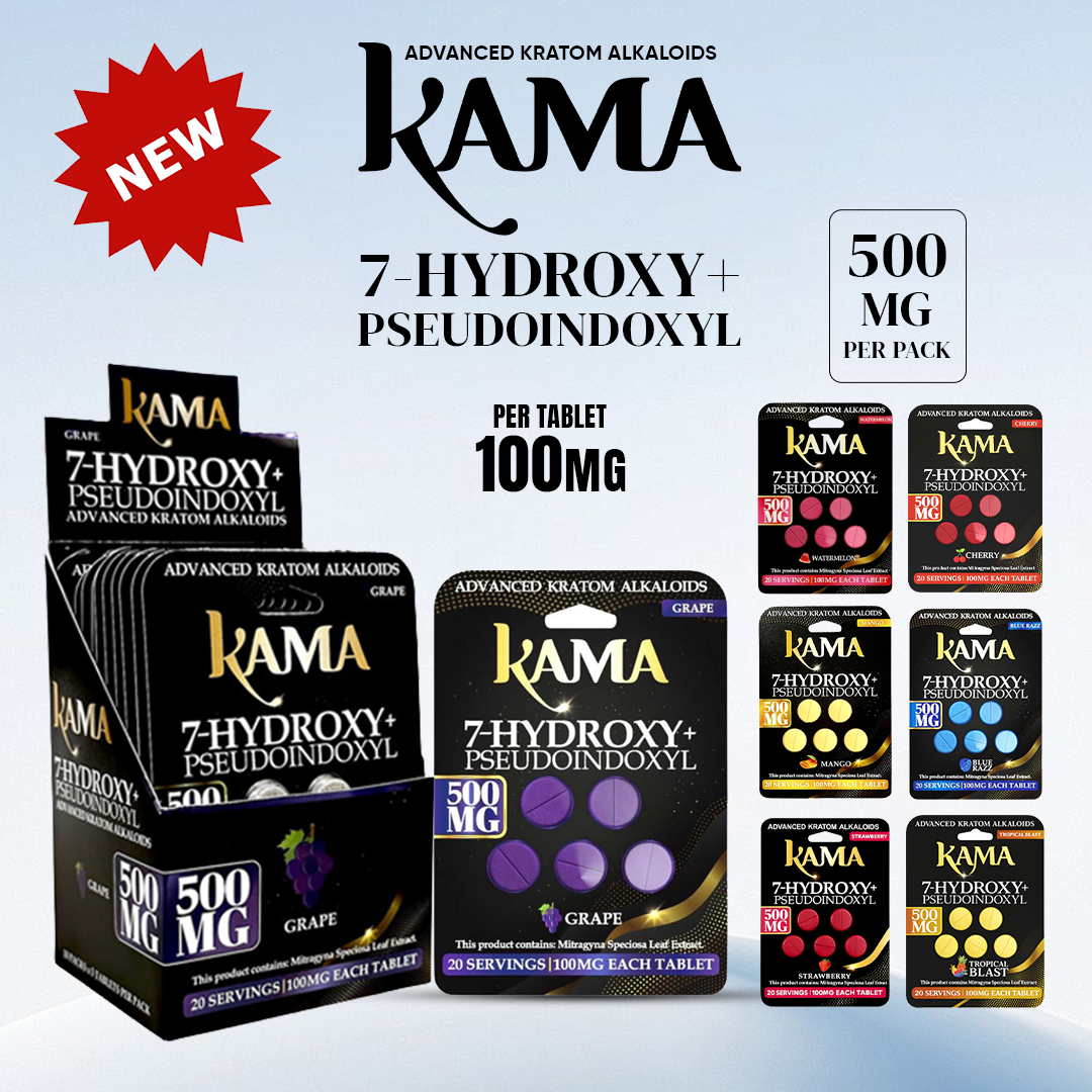The KAMA 5CT 1000MG 7-OH + PSEUDO KRATOM TABLETS 10PK BOX is a flavored tablet product designed for convenience and portability. Each pack contains 5 tablets with a total of 1000mg formulation, offering an easy-to-consume alternative to liquid or powder kratom products.